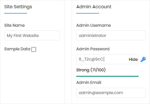 - Admin Username: Your new Concretecms username (for security reasons, do not use the administrator or the admin username).