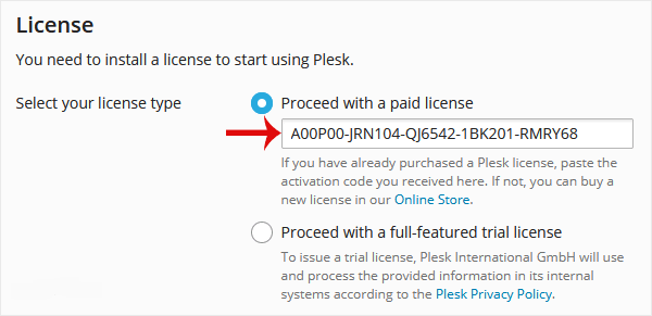 Step 4: Under the License section, should you have a license key, enter your Plesk Onyx license key or use a trial license by selecting a full-featured trial license.
